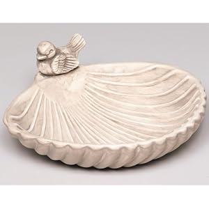 Keramik-Vogeltränke muschelförmig: mit einem Vogel; haltbar, widerstandsfähig und wetterbeständig, hervorragend in Form und Design; selbst im kleinsten Garten ist hierfür Platz. Farbe: creme-braun. Maße: Durchmesser 30 cm.